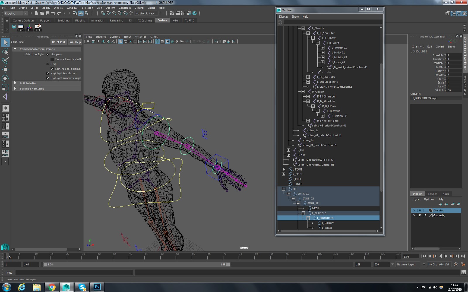 I used the polygon tool to create a polygon plane between the three joints (shoulder, elbow and wrist) to create an exact point for my 'E' controller to snap too...in following the tutorial I discovered that I had a rotation on my elbow joint....it meant recreating the arm joints but progress and no attibutes in the rotation channel box (bad juju - technical term)